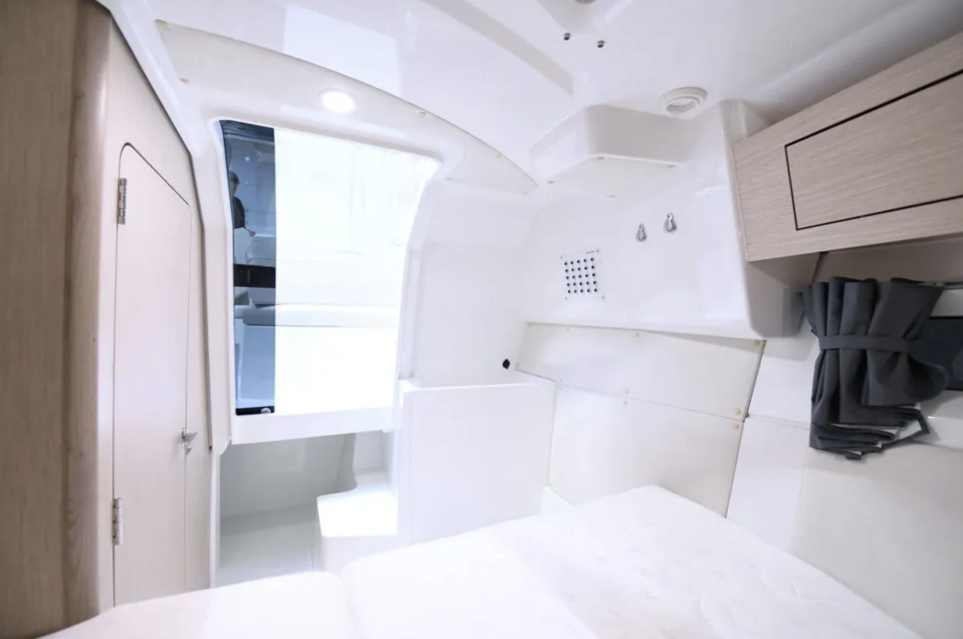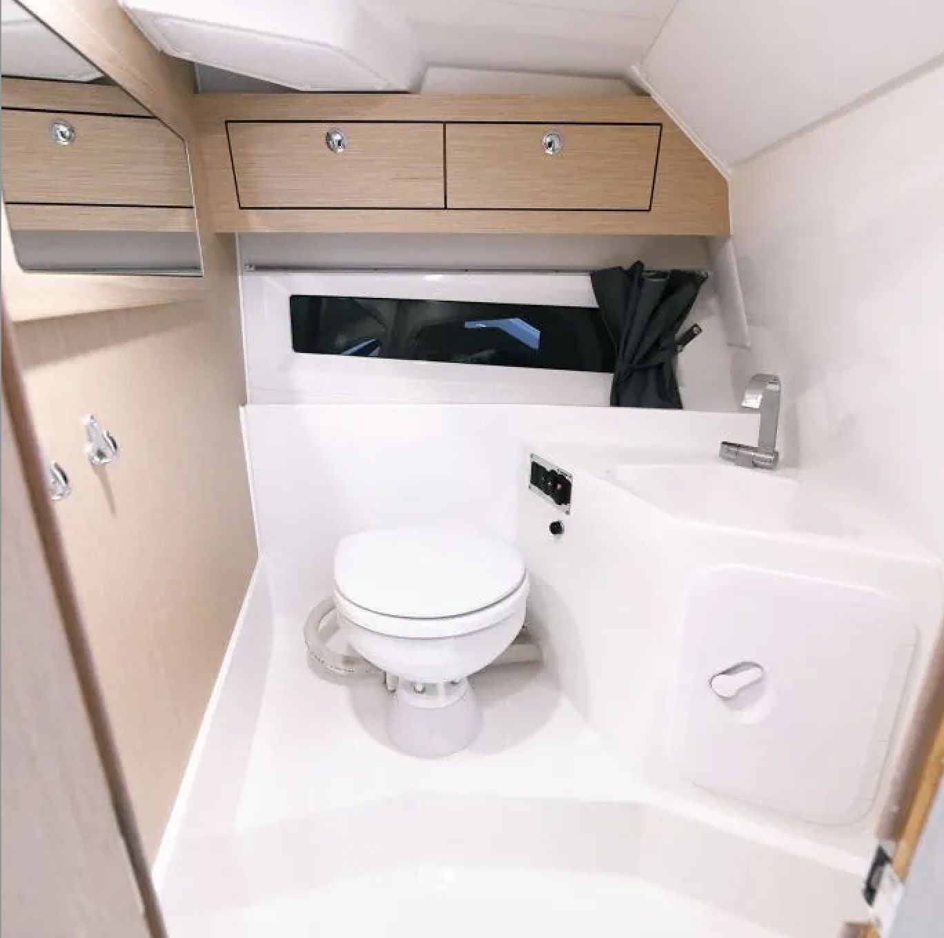 praktyczną lodówkę, funkcjonalną kuchenkę, toaletę morską z elektryczną pompą,liczne zamykane schowki i przestrzeń bagażową.