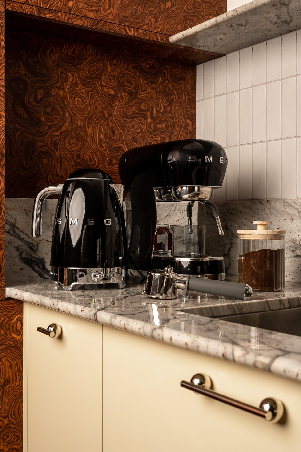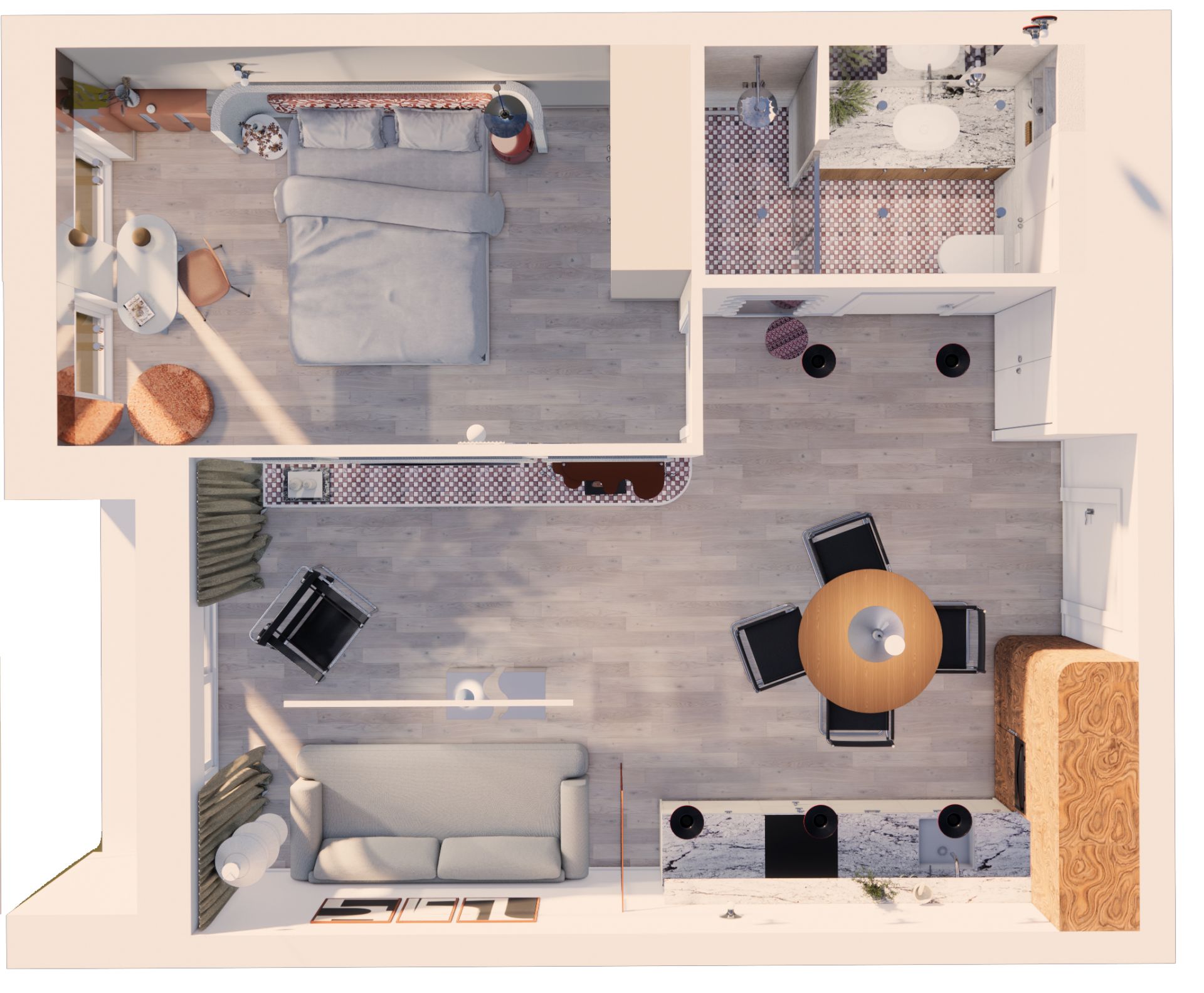 - Salon z aneksem kuchennym – nowoczesne wyposażenie zapewnia wygodę podczas dłuższych pobytów